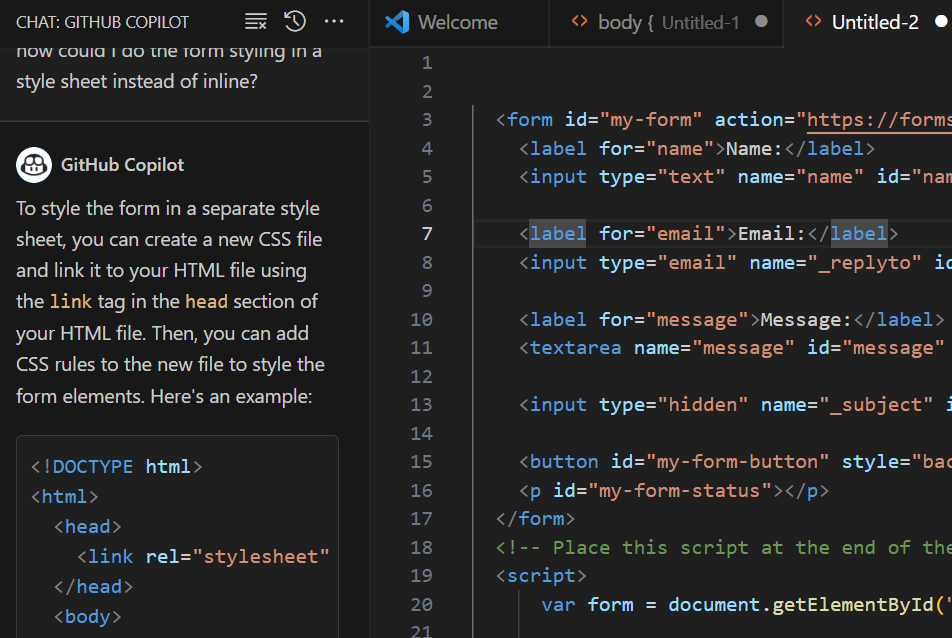 Then I used GitHub Copilot Chat to turn my inline styling into a stylesheet that I injected into my post.