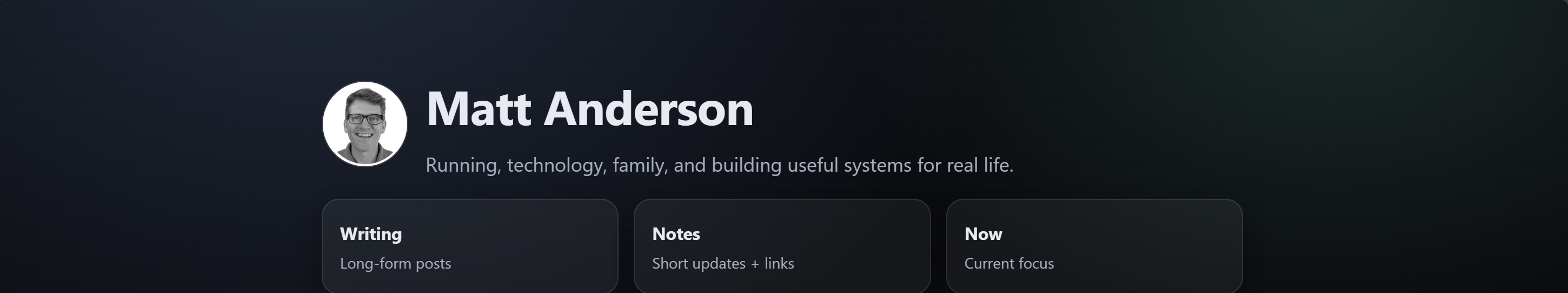 This year I simplified my www.matthewcanderson.com site, making it more durable and requiring less maintenance. I opted for HTML+CSS and a custom little build script to convert a now.md file to an html page. I’m happy with the result.